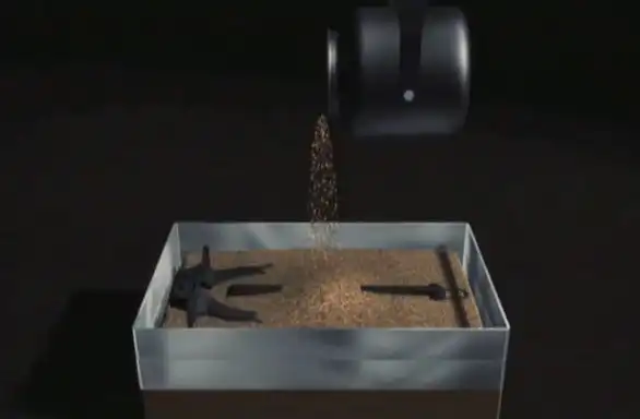 Спустя 12 часов достают остывшее литьё, но это не так просто как кажется. Металлические детали, как правило, пригорают к песчаной опоке, и теперь чтобы извлечь металл из форм их нужно раздробить. Вместе с глыбами затвердевшего кварца будущий якорь выбивают на вибрирующие решетки. Однако из-за высоких температур песок намертво пригорает к металлу, поэтому чтобы отделить пригар от свежеиспеченного якоря используют отбойный молоток.