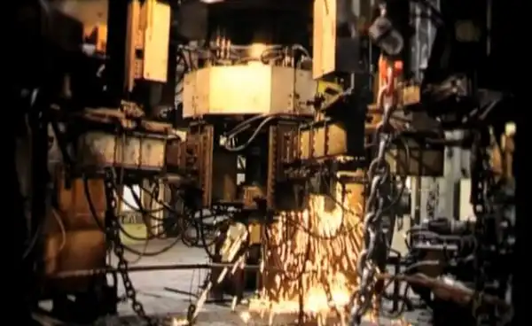 Однако сверхпрочные исполинские якорные цепи для многопалубных теплоходов, дебаркадеров и нефтеналивных платформ создает другая машина, которая скручивает массивные стальные прутья в два этапа. Чтобы гигантская цепь стала прочной в ее конструкции предусмотрена технологическая хитрость, которую производят в кузнице. Небольшие кусочки стали нагревают в печи до 1000 градусов. Через 30 минут раскаленные заготовки вытаскивают и без промедления отправляют под пневматический молот, сила удара которого 1 тонна. Кузнец обрушивает его на металл и мгновенно расплющивает стальные цилиндры. Затем каждую деталь выбивают из швов. Горячие обрезки отправляются в контейнер для дальнейшей переплавки, а то, что осталась и есть та самая маленькая хитрость, делающая гигантские якорные цепи невероятно прочными.