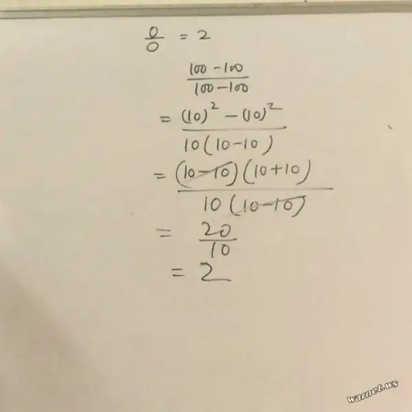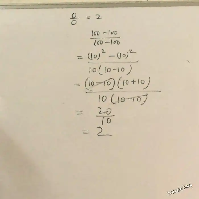 Сокращение в дроби — это то же деление, поэтому «сокращать» числитель и знаменатель на 0 нельзя, а значит нельзя было сокращать на (10-10). А вообще конечно ошибка в первой же дроби, т.к. такая дробь называется не определенностью, в том числе и потому что она в итоге может принимать любые значения. Согласны ?