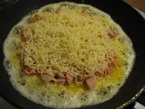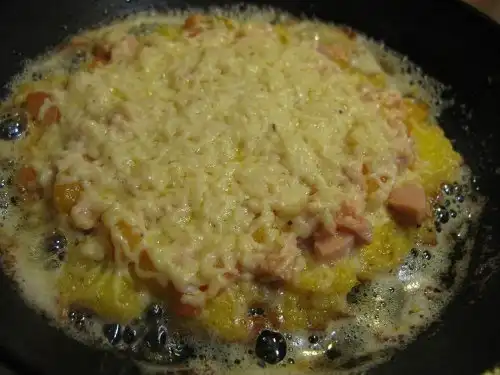 Накрыть крышкой и готовить на слабом огне, чтобы растопился сыр,а снизу немного подрумянить.