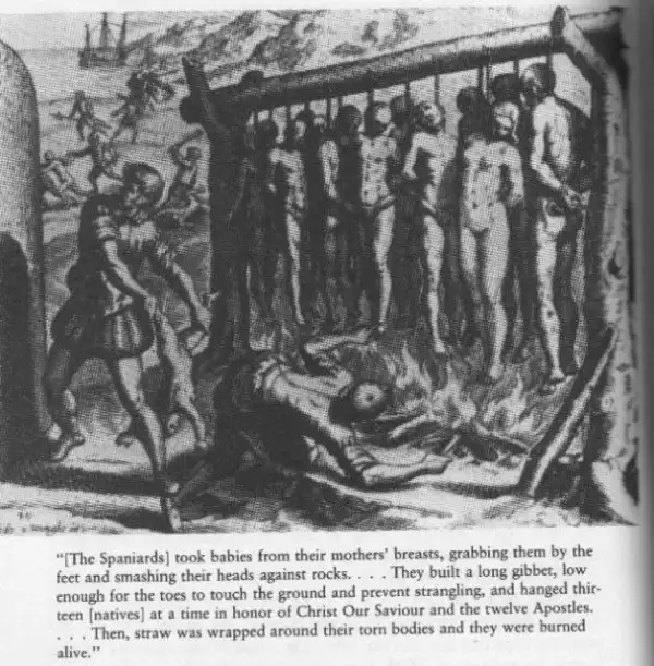 До прибытия Колумба земли, ныне занятые 48 штатами Америки населяли свыше 12 миллионов человек. Четыре века спустя население было сокращено до 237 тысяч, т.е на 95%. Как? Когда Колумб вернулся в 1493 году на 17 судах, он начал осуществлять политику угона в рабство и массового истребления населения стран Карибского бассейна. В течение трех лет было уничтожено пять миллионов человек. Еще пятьдесят лет спустя в ходе испанской переписи было зафиксировано только 200 000 индейцев! Лас Касас, основной историк Колумбийского эры, приводит многочисленные сообщения об ужасных актах, совершаемых испанскими колонистами над коренными народами, в числе которых повешения в массовом порядке, сжигание кос, разделывание на куски детей и скармливание их собакам — список зверств внушителен.