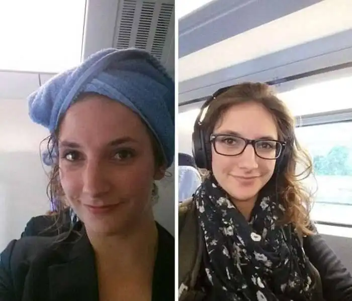 Девушка путешествует со всем своим гардеробом, ноутбуком и учебниками и моет волосы в вагонном санузле.
