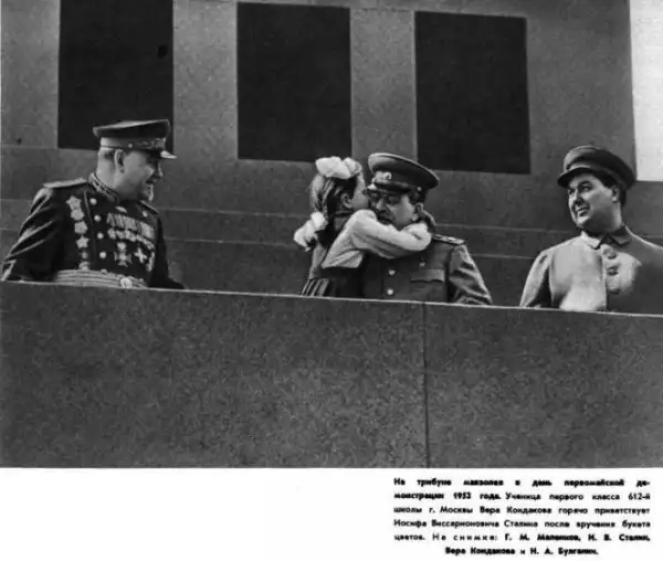 Маленькая девочка в обнимку с огромным Сталиным, белые банты на тонких косичках и густые усы на взрослом лице - фотография разлетелась огромными тиражами по всему Советскому союзу и сделала Веру Кондакову популярной. В "Пионерской правде" вышли стихи Сергея Михалкова: "Это - счастье!/ Нет иного слова!/ Девочка!/ Могла ли ты мечтать?/ Что ты можешь / Сталина родного/ В этот день увидеть и обнять?" Ее узнавали на улицах, приглашали на радио, а в день смерти Сталина вся школа пришла к ней в класс - разделить горе… Вера Кондакова до сих пор жива и живет в Москве, а знаменитая фотография всю жизнь висит на ее стене.