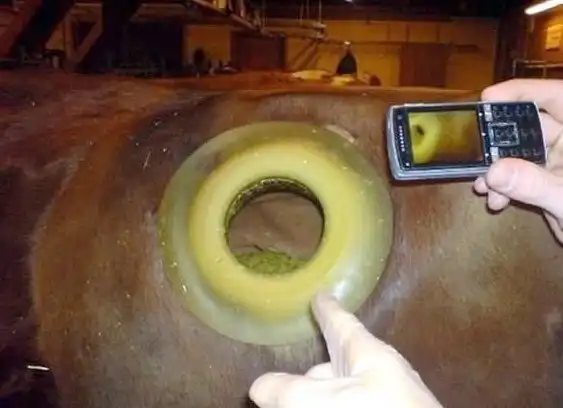 В общем, чтобы извлечь из коровы максимум пользы, её надо правильно кормить. Максимально правильно. И вот как раз для этого в первый отдел многокамерного коровьего желудка внедряют пластиковый порт диаметром с толщину руки взрослого человека – фистулу, или каннюлю.