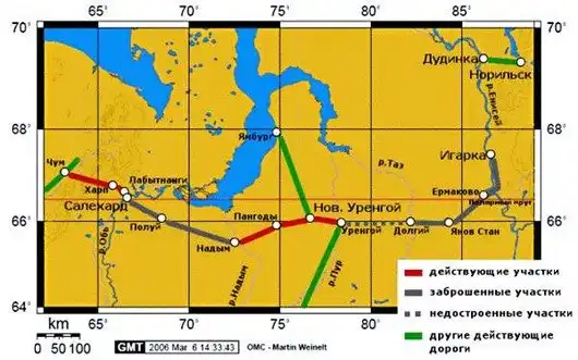 Полностью готовая линия Салехард-Надым была брошена, и не восстанавливалась. До начала90-хпо нему на полусамодельной дрезине ездили связисты, обслуживающие ту самую телеграфно-телефонную линию. Участок от Пура (ныне ст.Коротчаево) до Надыма был восстановлен Министерством нефтяной и газовой промышленности в 70-хгодах, а в начале80-хв Коротчаево с юга — из Тюмени — пришла новая магистраль.