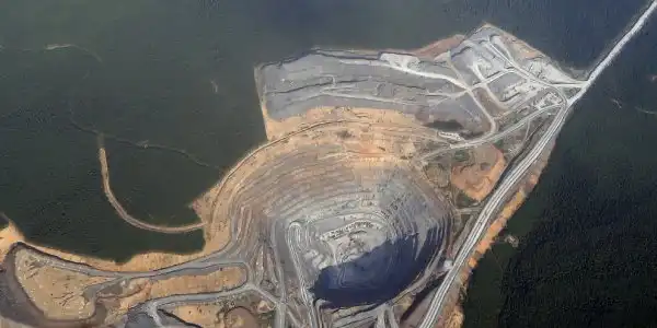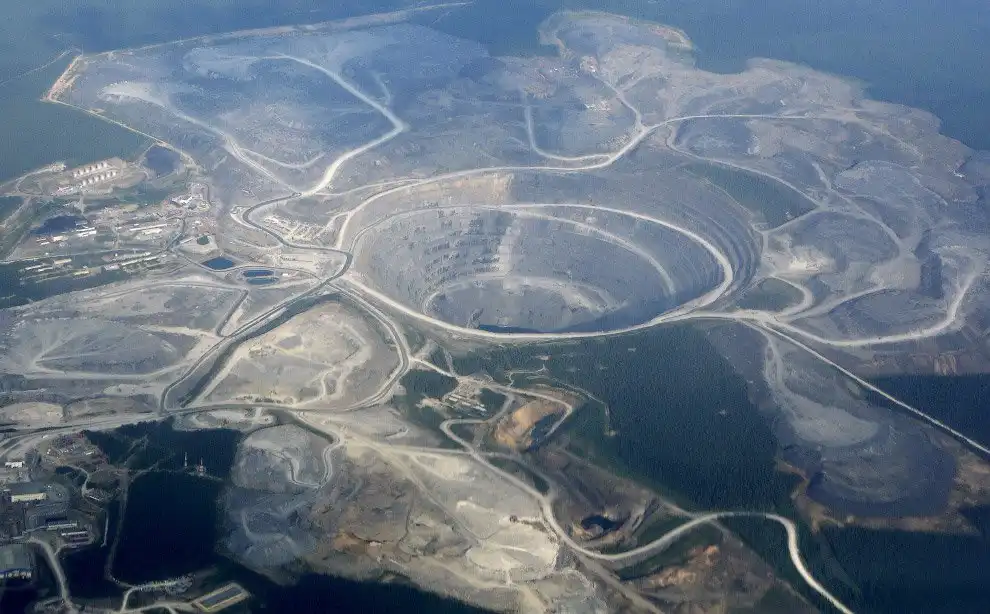 Маленькие здания слева на снимке помогают передать масштаб золотодобычи в Сибири.
