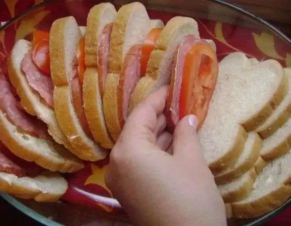 Между ломтиками хлеба вставляем кружочек колбасы и помидора.