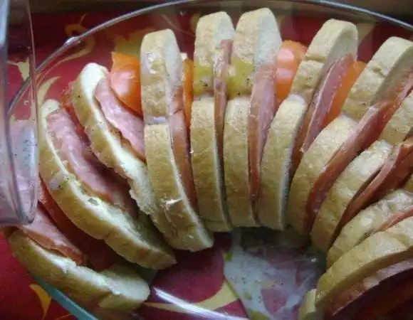 Нарезаем колбасу. Аналогичным образом нарезаем помидоры. Трем сыр на крупной терке. Мажем масло на хлеб тонким равномерным слоем. Чтоб не отягощать бутерброды лишними калориями, для себя я частично не мазала на хлеб масло. Выкладываем хлеб в форму, предварительно смазанную сливочным маслом.