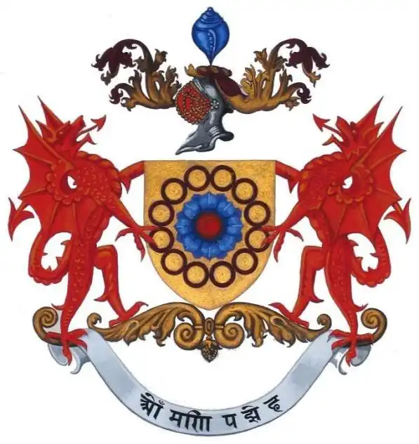 Поверх щита — развернутый вправо (для зрителя влево) рыцарский шлем европейской формы с ламбрекеном (кусок материи, покрывающей шлем) золотых и пурпурных цветов. Над шлемом лазоревая раковина моллюска (санкха). Санкха является символом произнесенного слова. Также входит в число четырех знаков Вишну. В данном случае раковина символизирует религиозную власть.