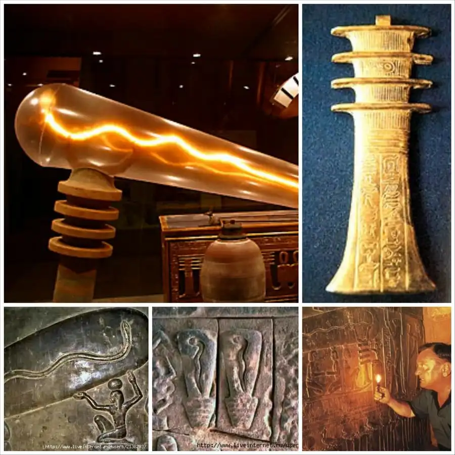 А что как нет? Что если во всем виноваты «тёмные века», лишившие европейцев исторической памяти? и «век электричества» наступил не во времена Фарадея и Яблочкова, а в дохристианскую эпоху? «Электрическое освещение имелось ещё в древнем Египте» – утверждают Петер Красса и Райнхард Хабек, посвятившие доказательству этой идеи свою книгу. Их основной аргумент – рельеф из храма богини Хатор в Дендере, созданный в 50 году до новой эры, во времена царицы Клеопатры. На этом рельефе виден египетский жрец, который держит в руках продолговатый предмет, напоминающий колбу электрической лампы, внутри колбы извивается змея; ее голова обращена к небу.