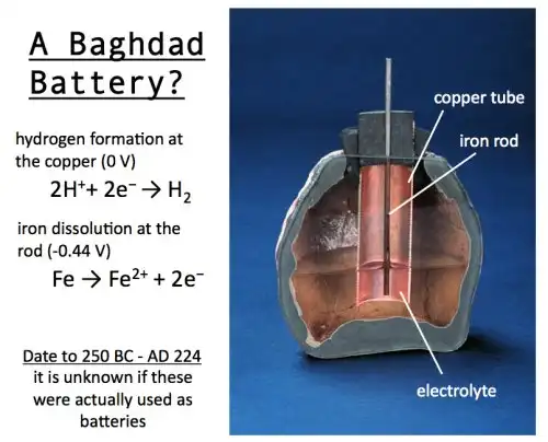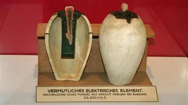 Объект, который принять называть электрической батарей 2000-летней давности (Baghdad Battery), в 1936г. был найден рабочими, равнявшими землю под новую железную дорогу в районе Куджут-Рабу, к юго-востоку от Багдада. Оказалось, что батарея находилась в подземной гробнице парфянского периода (247г. до н.э. – 228г. н.э.).