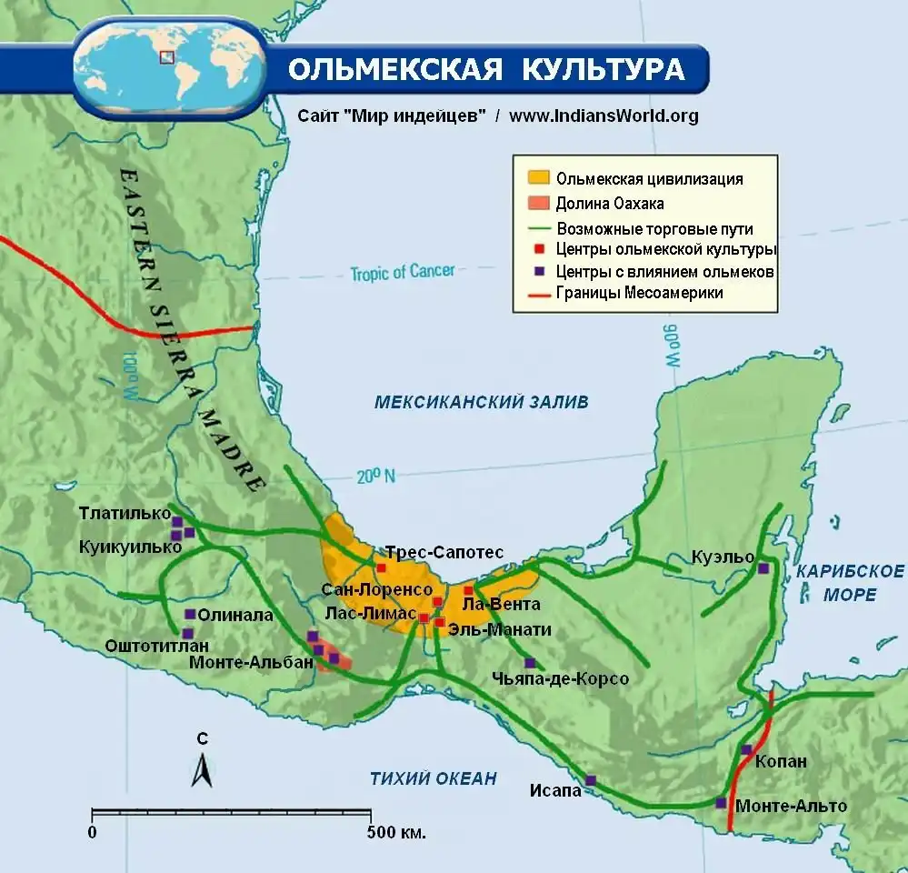 Цивилизация ольмеков считается первой, «материнской» цивилизацией Мексики. Как и все остальные первые цивилизации она возникает сразу и в «готовом виде»: с развитой иероглифической письменностью, точным календарем, канонизированным искусством, с развитой архитектурой. Согласно представлениям современных исследователей, цивилизация ольмеков возникла примерно в середине II тыс. до н.э. и просуществовала примерно тысячу лет. Основные центры этой культуры располагались в прибрежной зоне Мексиканского залива на территории современных штатов Тобаско и Веракрус. Но культурное влияние ольмеков прослеживается на всей территории Центральной Мексики. До сих пор не известно ничего о народе, создавшем эту первую мексиканскую цивилизацию. Название «ольмеки», означающее «люди каучука» дано современными учеными. Но откуда пришел этот народ, на каком языке говорил, куда исчез спустя века — все эти главные вопросы остаются без ответа после более чем полувековых исследований ольмекской культуры.