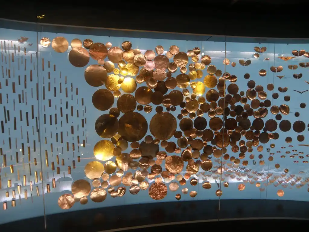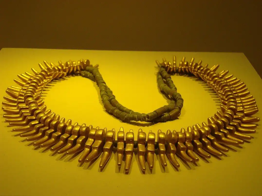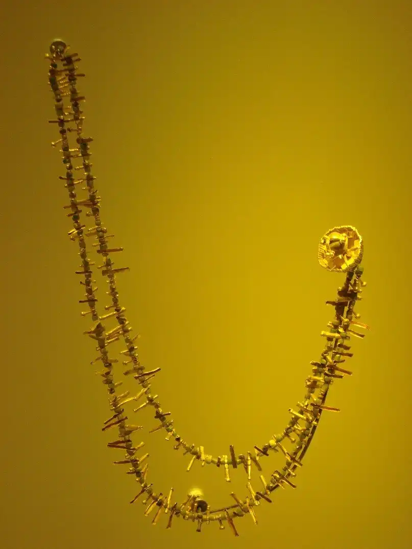 В начале экспозиции представлена огромная золотая раковина, точнее золотой слепок с древней, уже давно не существующей раковины. В музее еще предостаточно таких экспонатов, о которых можно сказать – сделаны с размахом. Уж чего, чего, а золота видимо древним ювелирам хватало всегда! Поражают размерами бусы и браслеты, а также изготовленные из золота бытовые предметы, рыболовные крючки, например.