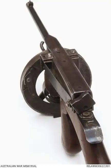 "Револьвер-пулемет" стреляет с открытого затвора. При его движении назад под действием силы отдачи он перещелкивает храповик, позволяющий кольцевому (...барабану — не похож, магазину? Тоже нет... Бубном будет.) бубну провернуться на один шаг, подставляя под удар вернувшегося вместе с затвором бойка следующий патрон.