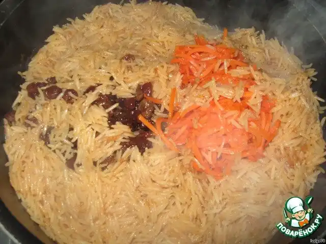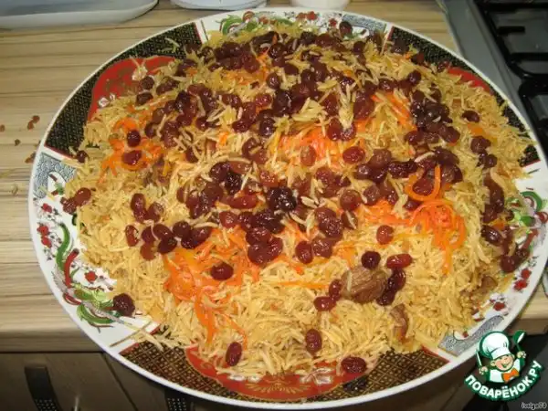 И все. Осторожно снимаем мясо, делаем раскопки, и по отдельности достаем изюм и морковь. Взяв шумовку, осторожно переворачиваем рис в кастрюле, чтобы не слипся, и кладем в блюдо. Сначала рис - горкой, а в середину сверху кладем мясо, присыпаем рисом немного, а затем морковь и изюм. Приятного аппетита!