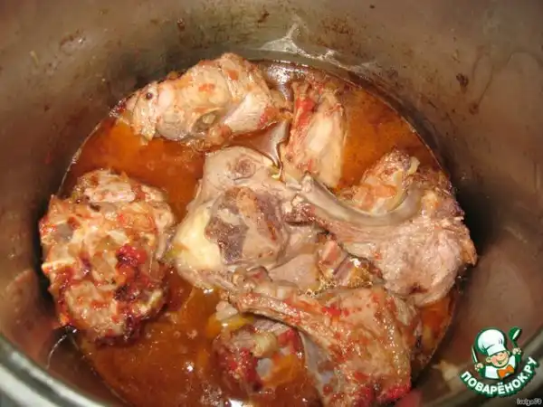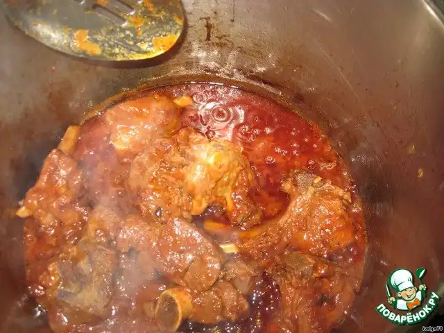 Вот и мясо готово! Теперь надо выпарить всю подливу до такого состояния, пока не увидите масло на поверхности, как картинке. Добавляем 1 стакан воды, быстро перемешиваем мясо, чтобы вкус весь остался в мясе, но и в подливу немного пошло, и сцеживаем в другую большую кастрюлю.