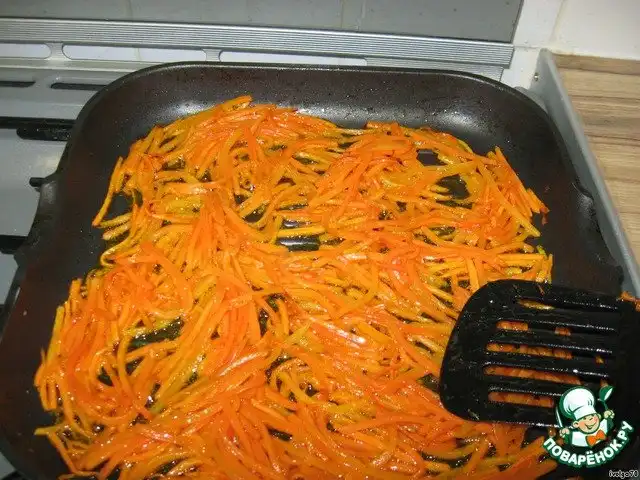 Пока все это дело варится, живенько перебираем изюмчик. Кипяточком заливаем, покрыв полностью, и даём постоять. Он набухнет, и вся грязь и песочек с него легко отойдет. Но давайте дадим ему время попариться. Берем морковочку, моем, чистим, нарезаем соломкой, как корейскую, чем длиннее, тем красивее на тарелочке! Ну, а тем временем в сковородочку наливаем маслица растительного без запаха, нагреваем, и морковку на приличный огонек, не томим, крышкой не накрываем, а сверху 2 ложки столовые сахара, и обжариваем эту красоту до готовности, выкладываем на отдельную тарелку!