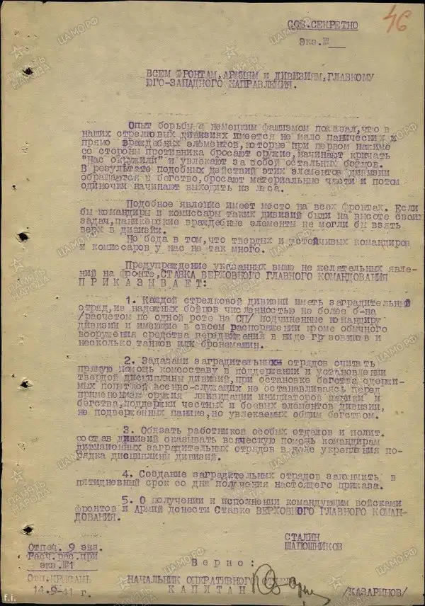 А вот и конкретная директива Ставки ВГК (001919 от 12 сентября 1941) , которым предписывалось иметь заградительные отряды в каждой дивизии, с вполне конкретными задачами "ликвидировать инициаторов паники".