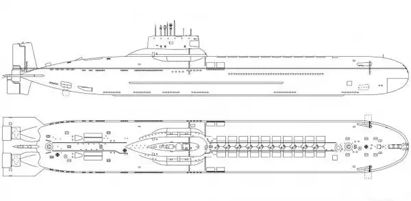 Конструкция подводной лодки проекта 941 выполнена по типу «катамаран»: два раздельных прочных корпуса расположены в горизонтальной плоскости параллельно друг другу. Кроме того, имеется два отдельных герметичных капсулы-отсека - торпедный отсек и расположенный между главными корпусами в диаметральной плоскости модуль управления, в котором находится центральный пост и размещенный за ним отсек радиотехнического вооружения. Ракетный отсек находится между прочными корпусами в передней части корабля. Оба корпуса и капсулы-отсеки соединены между собой переходами. Общее число водонепроницаемых отсеков девятнадцать. Отсек центрального поста и его легкое ограждение, смещены в сторону кормы атомной подводной лодки. Прочные корпуса, центральный пост и торпедный отсек выполнены из титанового сплава, а легкий корпус - из стали (на его поверхность нанесено специальное гидроакустическое резиновое покрытие, повышающее скрытность субмарины). Подводная лодка «Акула» имеет развитое кормовое оперение. Передние горизонтальные рули расположены в носовой части корпуса и складываются. Рубка снабжена мощными ледовым подкреплениями и крышей округлой формы, служащей для раскола льда при всплытии.