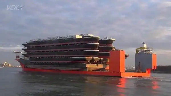 Баржи на фото выше, которые весят в общей сложности 60 000 тонн, были перевезены из Кореи в Роттердам. По этому поводу может возникнуть вопрос – каким образом столь увесистые грузы оказываются на палубе корабля, ведь грузоподъемности промышленных кранов не дотягивают до таких цифр.