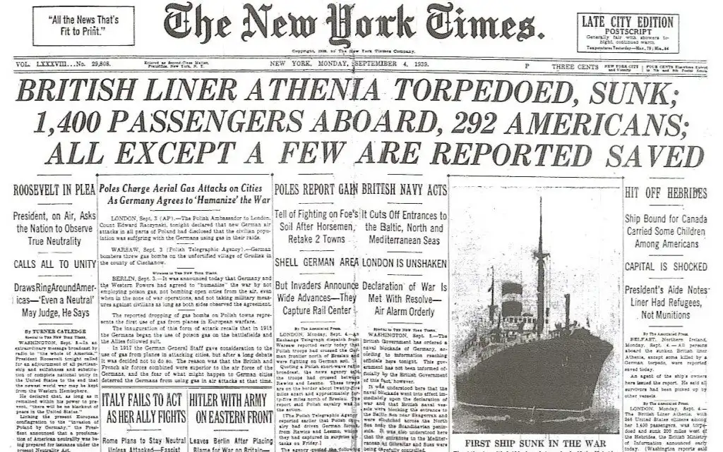 В тот самый день, когда была объявлена война немецкая подводная лодка U-30 вышла к северо-западному побережью Ирландии. На ее борту находилось 11 торпед и 44 лучших подводников, готовых к «охоте». В тот же день пассажирский пароход «SS Athenia» вышел из Британского порта и взял курс на Канаду. Многие из сотен его пассажиров спасались от гитлеровского вторжения в страны Западной Европы.