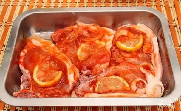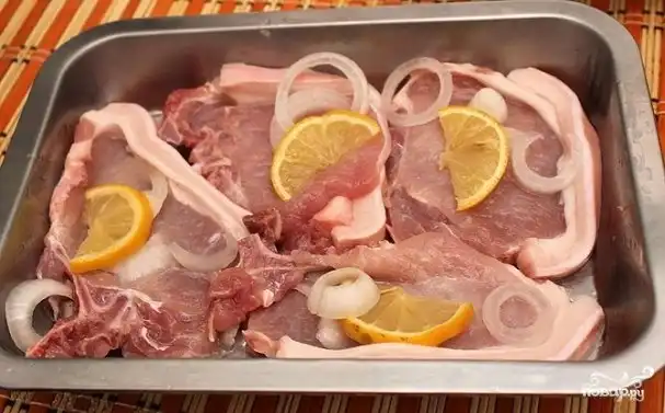 Свинину нарезать порционными кусочками, слегка отбить, уложить в форму для запекания, сверху выложить нарезанный кружочками лук и лимоны, посолить
