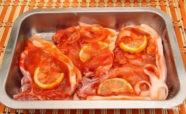 Мед смешать со специями и кетчупом, полученным соусом залить подготовленное мясо.
