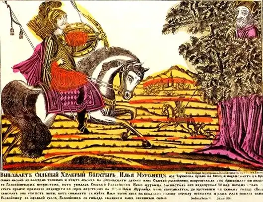 Выезжает сильный храбрый богатырь Илья Муромец. Лубок из коллекции Ровинского. 1876 год