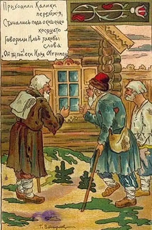 К Илье Муромцу приходят калики перехожие. Открытка Г. Войцеховича. Начало XX века