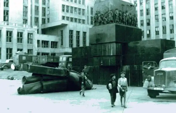Оккупированный Минск. Памятник Ленину у дома правительства БССР сброшен с постамента.