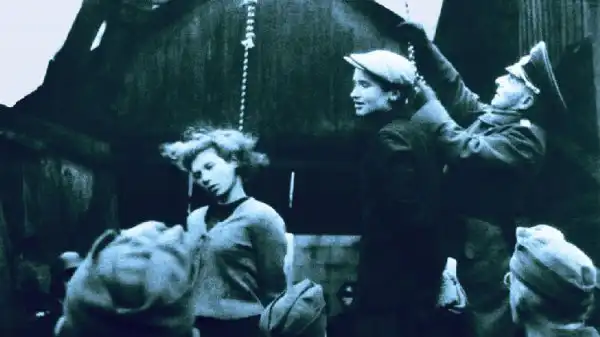 Оккупированный Минск. Казнь жителей, прятавших раненых красноармейцев. Петлю на шее 16-летнего Владлена Щербацевича затягивает лично майор Антанас Импулявичюс – командир 2-го литовского батальона полицейской вспомогательной службы.