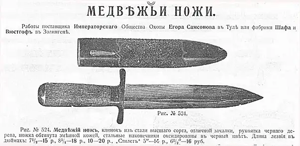 Цена медвежьего ножа Самсонова по каталогу Бернгарда и К. — 13 руб. Такой же «Роджерсь» предлагался по 21 руб. В описании указано, что «клинки разрубают монеты» — ходовая по тем временам реклама качества холодного оружия.