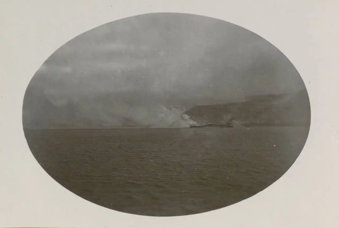 «… Стюард промчался (позже он погиб) мимо каюты, где я помогала детям одеться к завтраку, и крикнул: «Закройте дверь каюты — приближается вулкан!» Мы закрыли дверь, и в тот же момент раздался ужасный взрыв, от которого чуть не лопнули барабанные перепонки. Судно поднялось высоко в воздух, а потом, казалось, все тонет, тонет. Удар сбил нас с ног, и мы сжались в одном углу каюты.