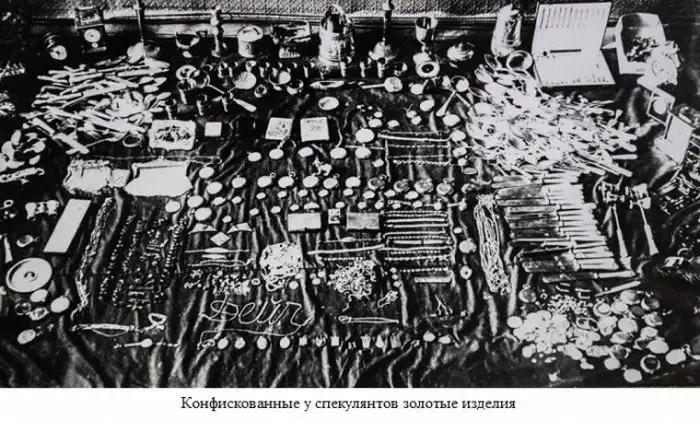 "Органы НКВД изъяли у питерских спекулянтов и воров 9,5 миллиона рублей наличных денег, 41 215 рублей золотой монетой и 2,5 миллиона рублей облигациями госзаймов, а также почти 70 кг золота, полтонны серебра, 1537 бриллиантов, 1295 золотых часов, 36 км мануфактуры и 483 тонны продуктов питания! Уже одни эти цифры говорят о том, что уровень жизни в блокадном Ленинграде у разных людей сильно отличался.