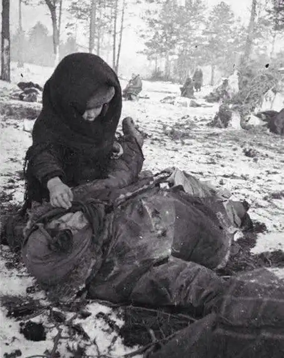 На фото: ребенок рядом с убитой матерью в концлагере для гражданского населения «Озаричи». Белоруссия.
