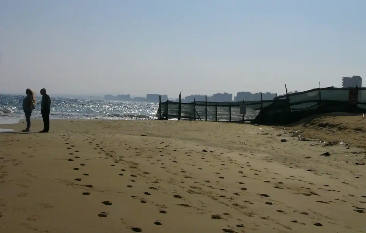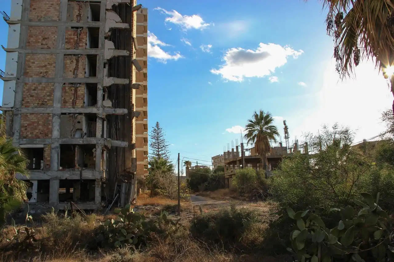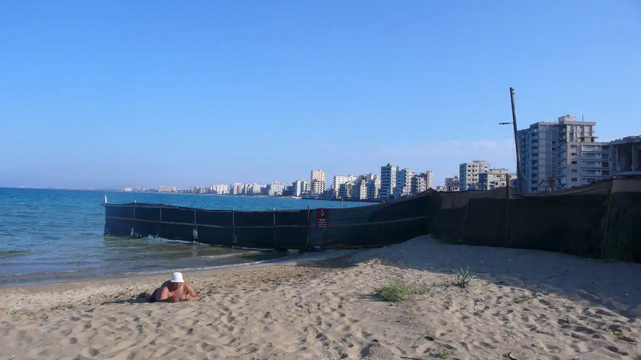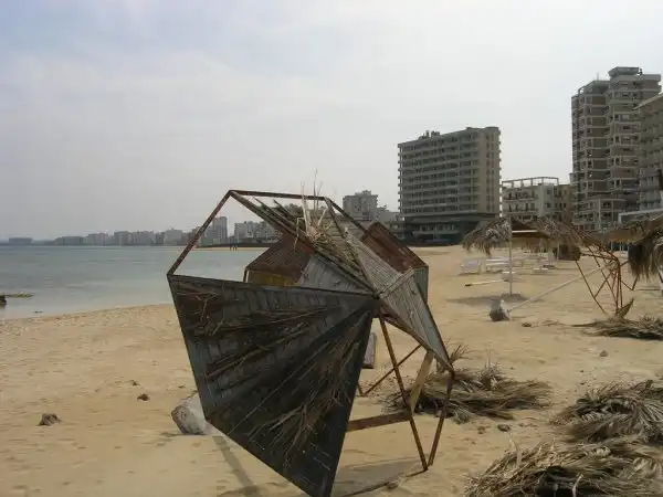 И, что самое интересное, в непосредственной близости от заброшенных кварталов расположены вполне обитаемые районы города Фамагуста (турецкая часть Кипра), в том числе, и несколько прибрежных отелей. А пляж одного из них впивается аппендиксом в город-призрак, огражденный от него забором из черной материи. Граница при этом проходит всего в нескольких десятков метров от лежаков и зонтиков.