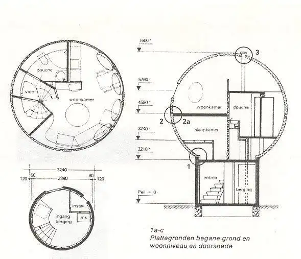 Планировка этих сооружений достаточно необычна: в центре сферы ванная комната и крошечная спальня, а чтобы попасть в гостиную и кухню, необходимо подняться на второй этаж-уровень. Всего за один день дом можно полностью разобрать и перевезти в любое другое место (вес данного сооружения всего около 1250 килограммов). К тому же данную постройку можно разместить не только на земле, но и на воде, на стационарной платформе.