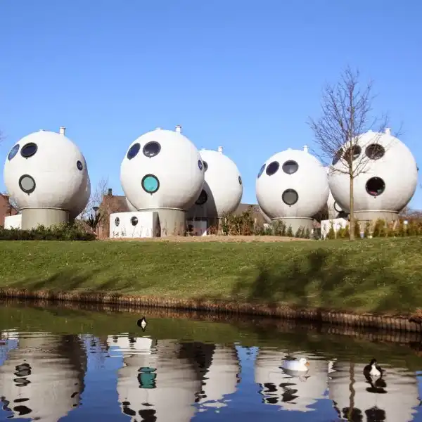 В 1968 году правительство Нидерландов выделило финансирование на экспериментальное строительство в этом историческом месте недорогого жилья. В конкурсе победил проект архитектора Дриса Крейкампа «Bolwoningen», что в переводе означает — «дома-шары». Вот так в 1980-х на родине Босха появилась эта причудливая колония из 50 круглых домов. Шары были изготовлены из цемента, усиленного стекловолокном. Их диаметр составляет около 5,5 метров, крепятся они на основании в виде цилиндра. Один шар, оснащенный 11 круглыми окнами — квартира на одного-двух человек.