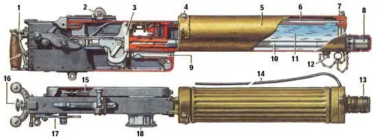 1 — предохранитель, 2 — прицел, 3 — замок, 4 — пробка наливного отверстия, 5 — кожух, 6 —пароотводное устройство, 7 — мушка, 8 — надульник, 9- трубка вывода гильз, 10- ствол, 11-вода, 12-пробка выливного отверстия, 13 - колпачок, пароотводная кишка, 15-возвратная пружина, 16-спусковой рычаг, 17-рукоятка, 18-приемник.