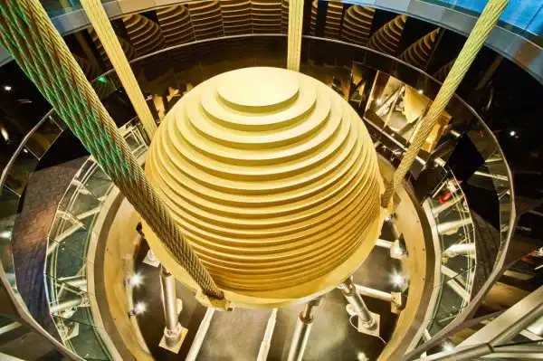 В 2004 году самым высоким зданием в мире была 509-метровая башня Тайбэй 101 в Китае. Внутри этого здания установлен гигантский противовес в виде шара, характеристики которого поражают воображение! Его диаметр равен — 5.5 метров, а вес — 728 тонн. Шар способен гасить колебания небоскреба, даже если скорость ветра составляет 240 км/час.