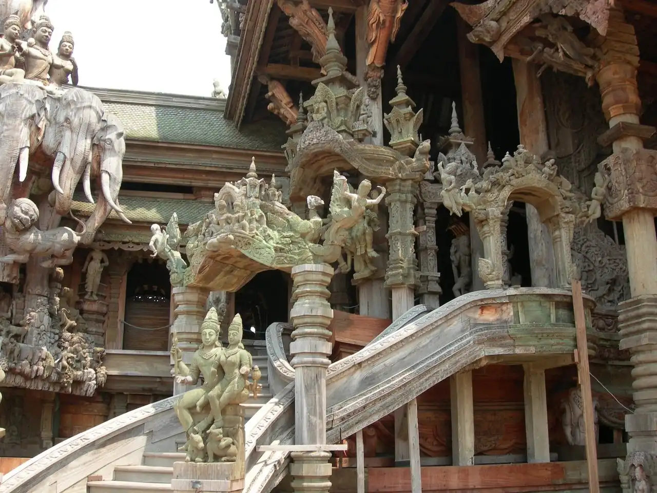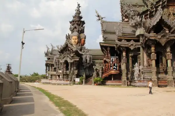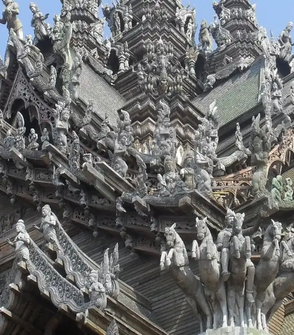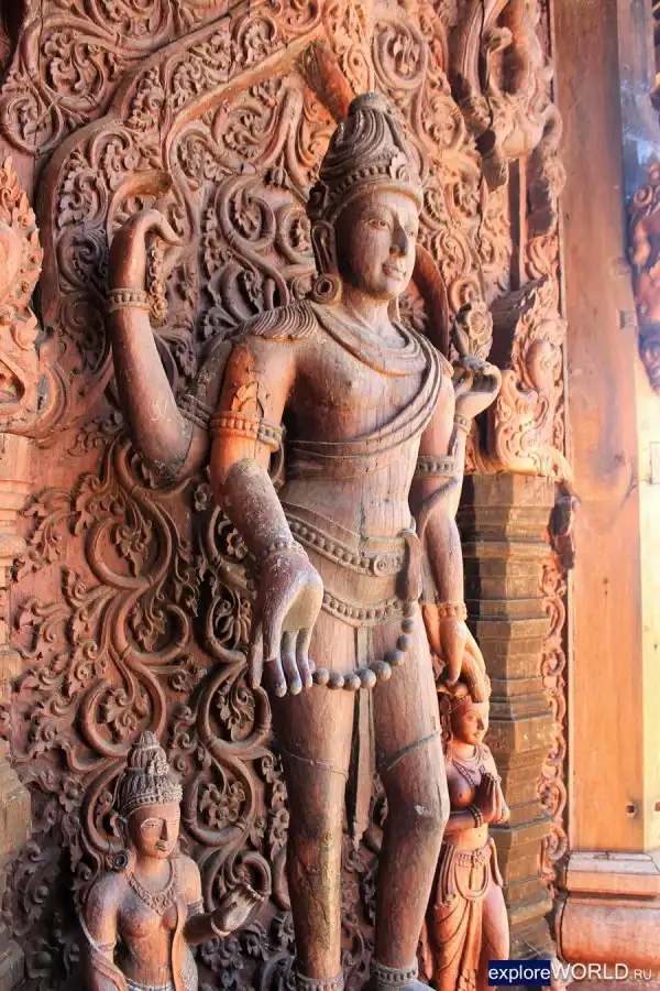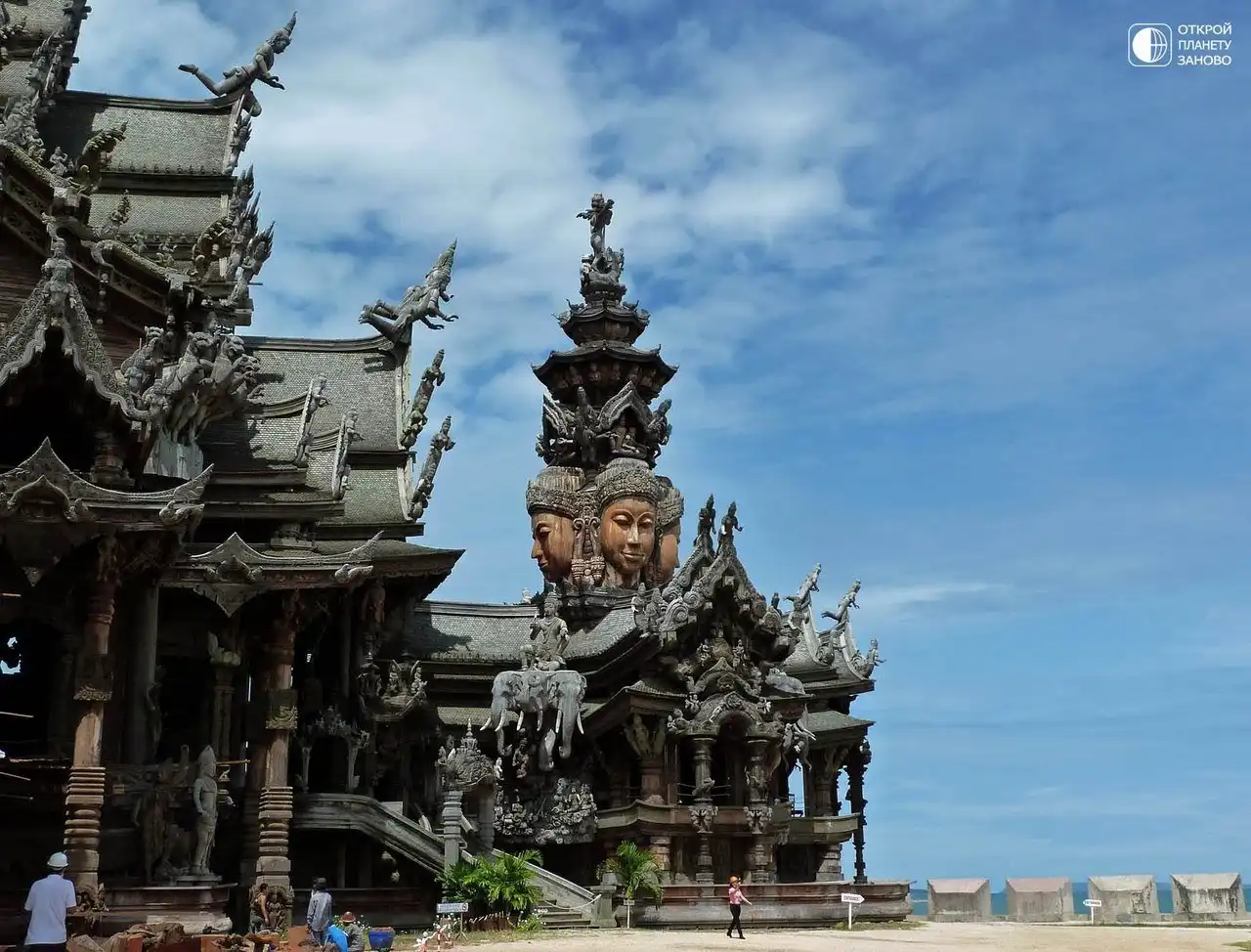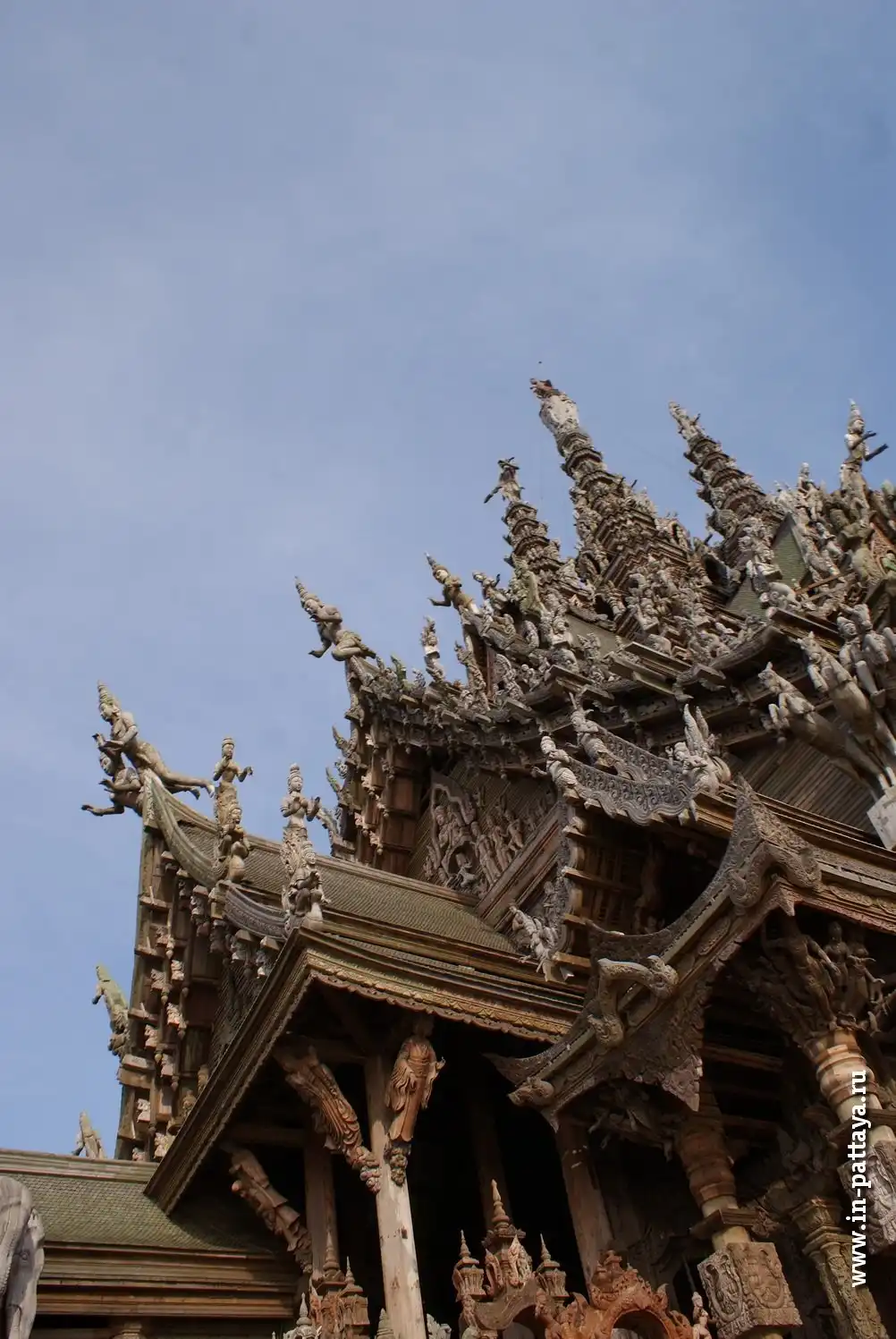 Храм Истины создан по древней технологии возведения тайских зданий, и каждый его квадратный сантиметр покрыт резным деревом. Все соединения без единого гвоздя. Задумкой при строительстве этого святилища стало использование искусства и культуры как отражения старого видения Земли, знаний предков, и восточной философии. Это действительно необычное здание, которое местные люди называют «Prasath Satya-thaam», что в переводе на русский звучит как «Святилище Истины» или «Храм Истины».