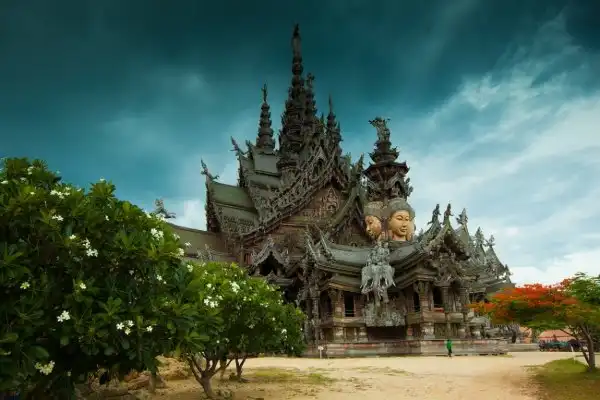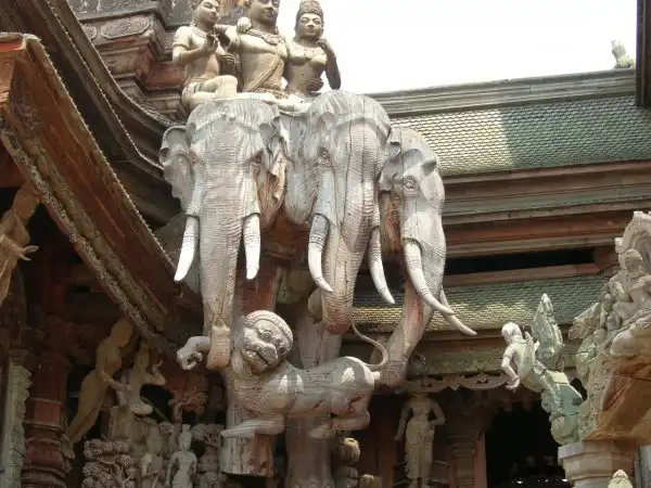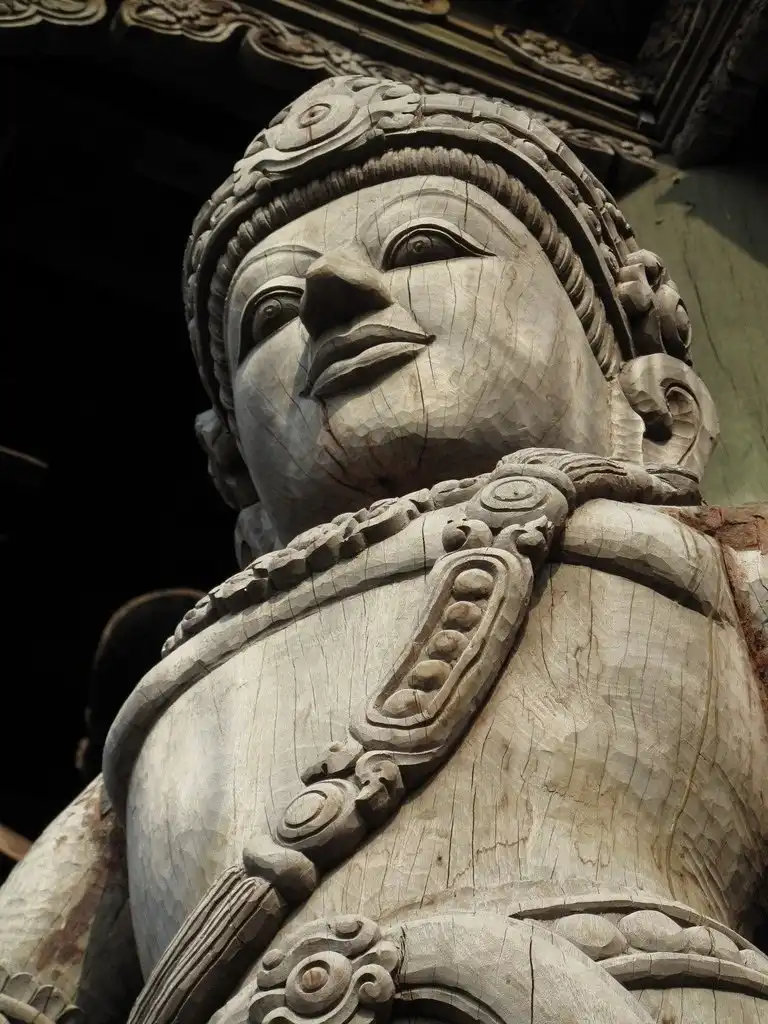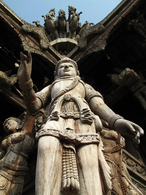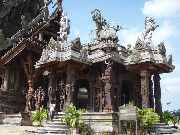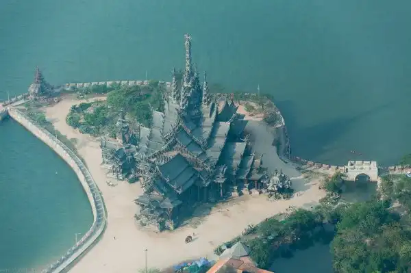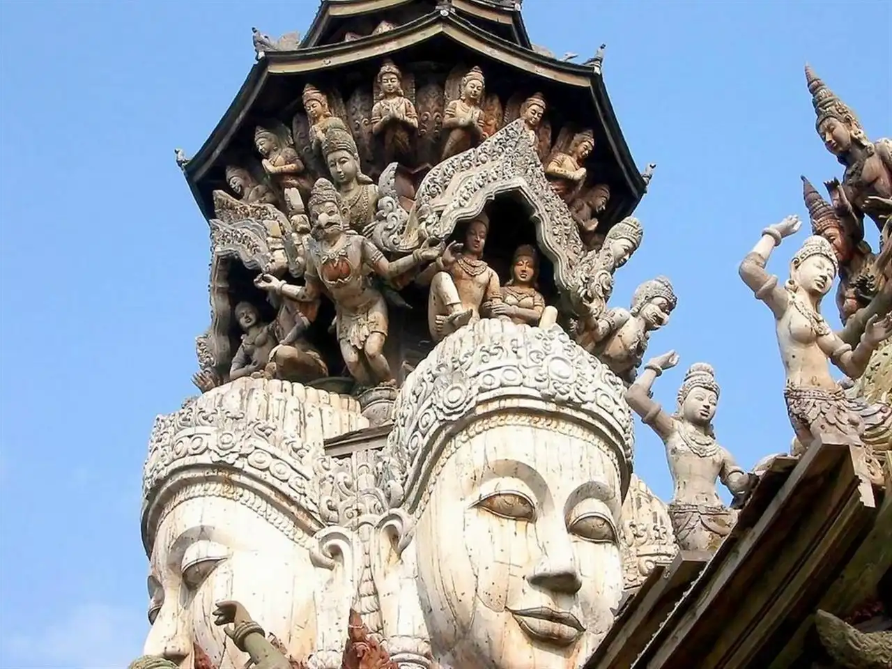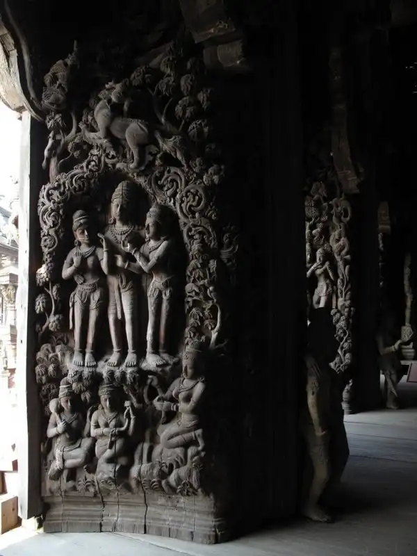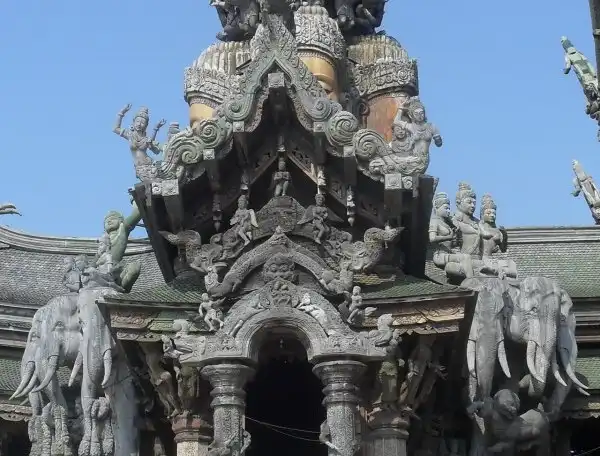 Храм Истины создан по древней технологии возведения тайских зданий, и каждый его квадратный сантиметр покрыт резным деревом. Все соединения без единого гвоздя. Задумкой при строительстве этого святилища стало использование искусства и культуры как отражения старого видения Земли, знаний предков, и восточной философии. Это действительно необычное здание, которое местные люди называют «Prasath Satya-thaam», что в переводе на русский звучит как «Святилище Истины» или «Храм Истины».