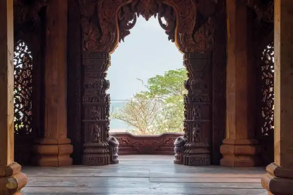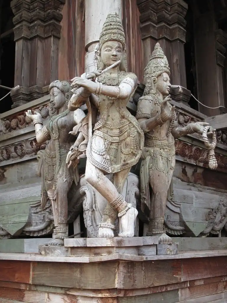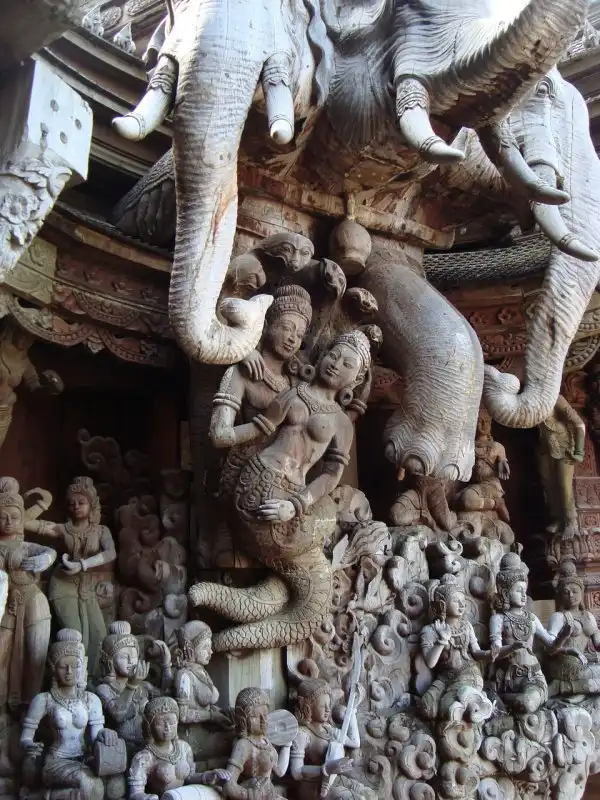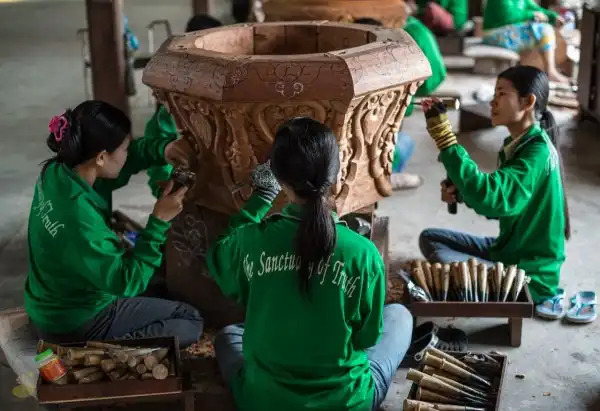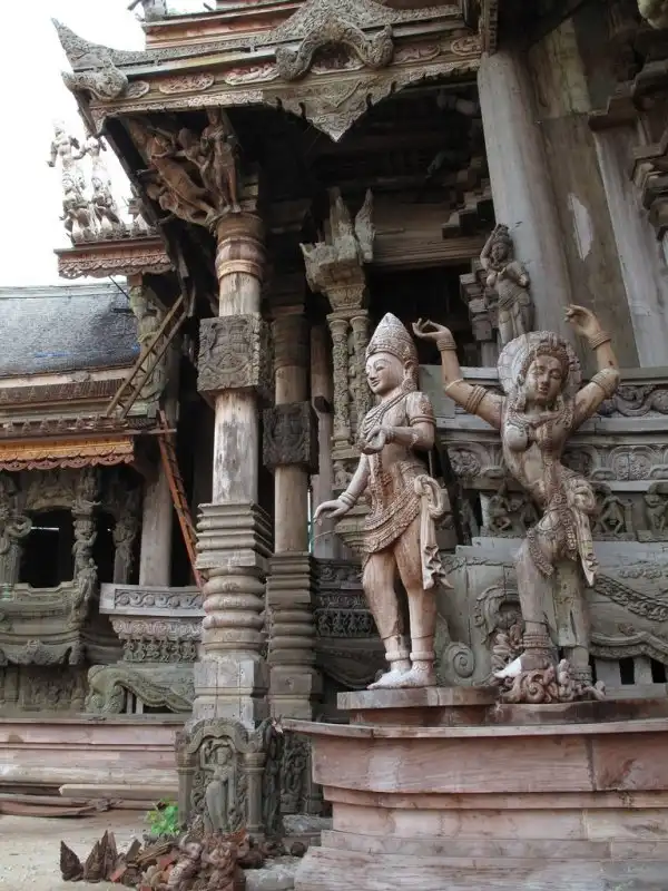 Что же представляет собой этот храм и каково его предназначение? Дивной красоты сооружение возводится исключительно из деревянных деталей, без использования гвоздей. Породы деревьев для строительства выбираются самые ценные, красивые, прочные и максимально приспособленные к особенностям здешнего климата. Сотни искусных резчиков год за годом без устали трудятся над тонкой ажурной резьбой по золотому тику и красному дереву. Архитектурный стиль строения отсылает к древнему кхмерскому зодчеству.