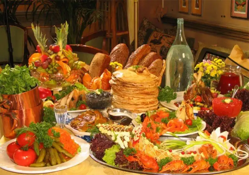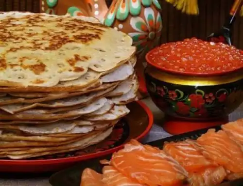 Одно из самых древних русских блюд - блины. Никто не знает, когда блины появились на русском столе, но известно, что они были ритуальным блюдом еще у языческих славянских народов. Самые разнообразные поверья и традиции связаны у русских людей с блинами: блины были обязательным блюдом на поминках, ими же кормили роженицу во время родов. Одна из сохранившихся до наших дней традиций, связанных с блинами - Масленица - древний языческий праздник. В течение целой недели перед Великим Постом во всех русских домах пекут блины и едят их с различными закусками - икрой, сметаной, рыбой, мясом, грибами.