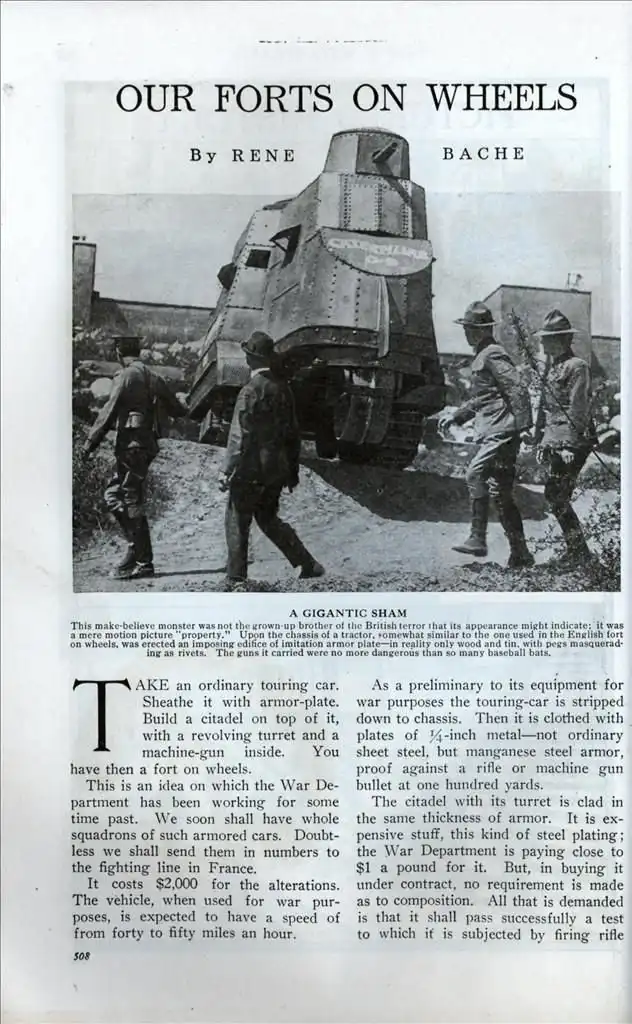И всё же, раз опытный образец был в наличие, ему нашли применение в отделе… пропаганды американской армии, где нашлись очень разумные ребята, которые начали фотографировать его в разных видах и писать о нем «забойные» статьи в различные журналы. Так, например, журнал «Современная механика» писал, что у Америки имеются бронеавтомобили с броней стоимостью 1 доллар за фунт из марганцевой броневой стали, надежно защищающей их экипажи от пуль! В одном случае это грузовики, прикрытые четвертьдюймовыми плитами брони, в другом и вовсе это «форт» с башней, который может двигаться со скоростью 25 миль в час! Тут же указывались и цены на эти «авто» – 5 и 8 тысяч долларов, причем последние имеют две башни с пулеметами. То есть речь явно шла именно о колесных броневиках, однако фотография изображала первый вариант Tracklayer Best 75!