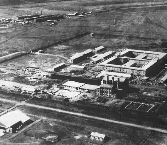 Вся территория была окружена рвом и забором с колючей проволокой под током. Так же на данной территории располагались: аэродром, электростанция, железнодорожная ветка, жилые помещения, помещения учебного центра, тюрьма на 100 человек, многочисленные лаборатории, стадион и даже синтоистский храм. Строительство заняло больше года.