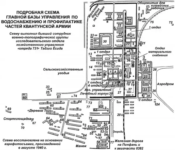 Для того чтобы расчистить площадку под строительство на 40кв.м, были сожжены 300 китайских крестьянских домов. В собственности данного отряда было авиационное подразделение, истребителям которого было приказано сбивать любой летательный аппарат, пролетавший над территорией. Секретность была настолько высока, что постройка официально называлась «Главным управлением по водоснабжению и профилактике частей Квантунской армии».