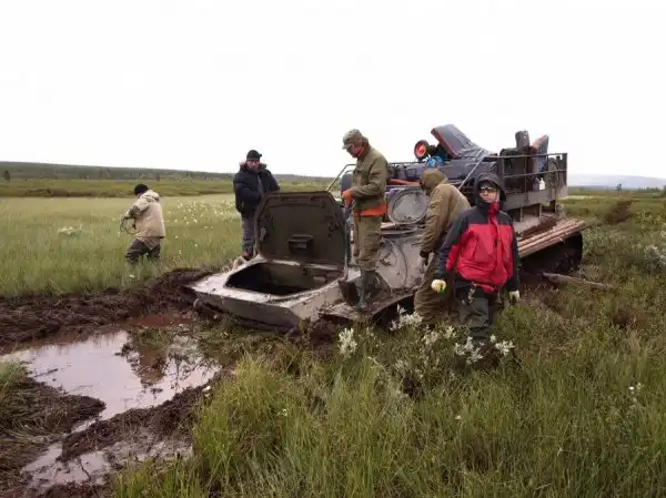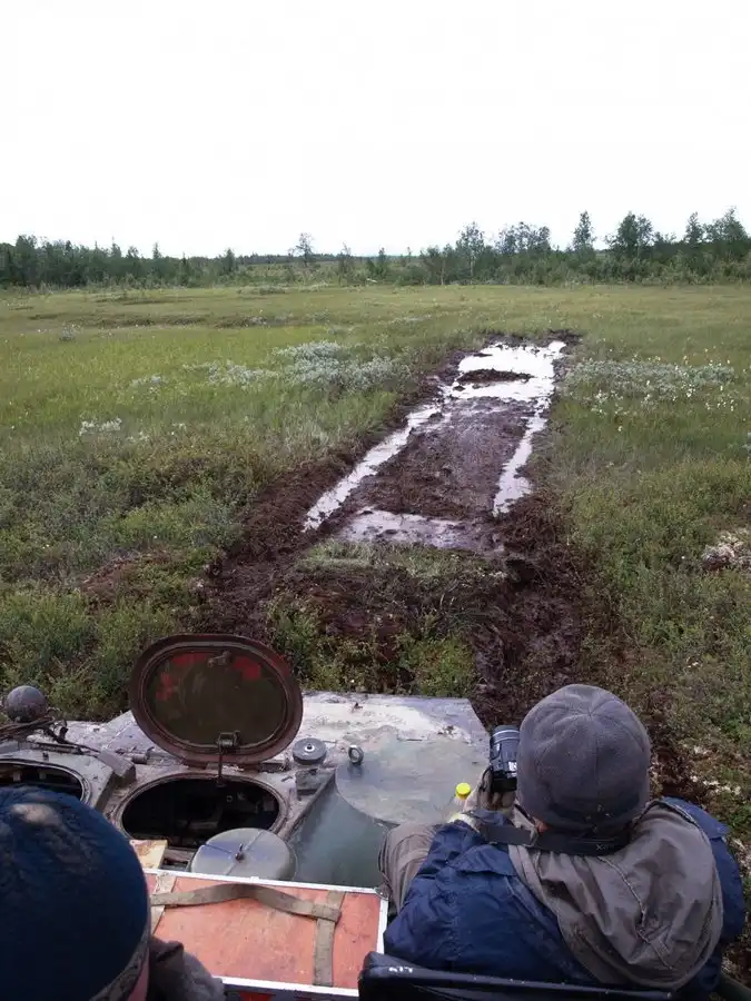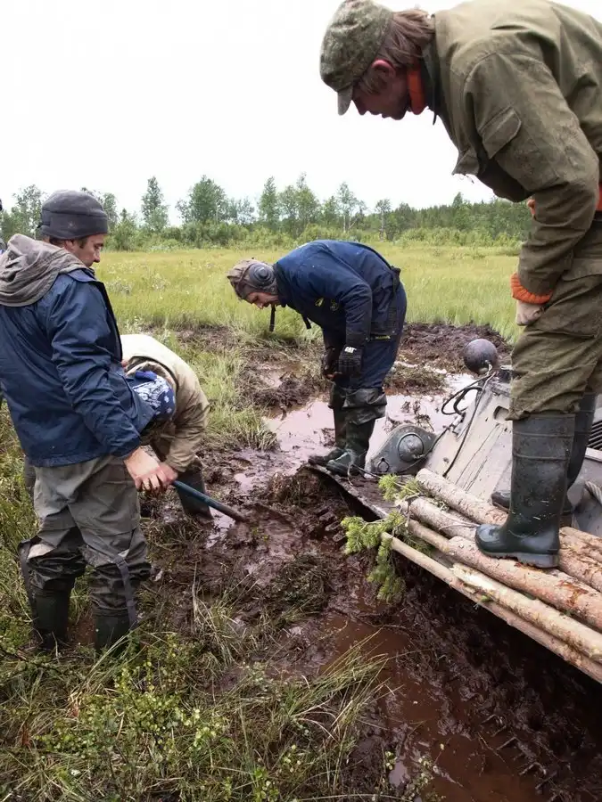 Наш вездеходчик Андрей очень опытен и осторожен, и судя по всему не любит сидеть на болоте. Однако часок мы покряхтели, принося бревна и вспоминая как это было раньше.