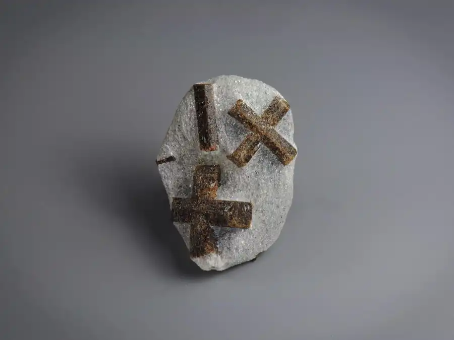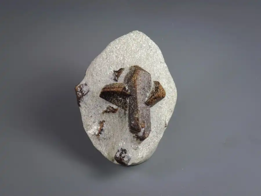Ставролит "косой крест" после обработки. Каждый добытый образец требует ручной препарации в мастерской, ведь кристаллы частично скрыты под слюдой.