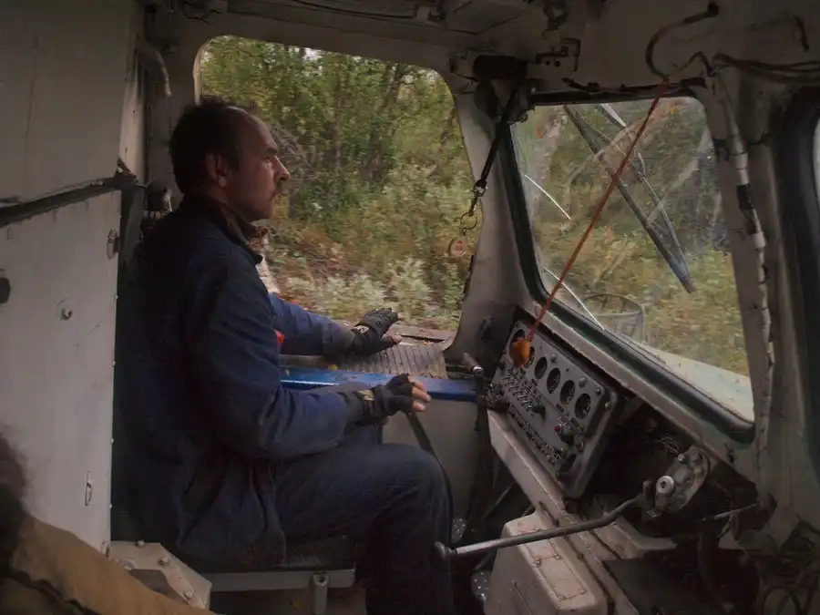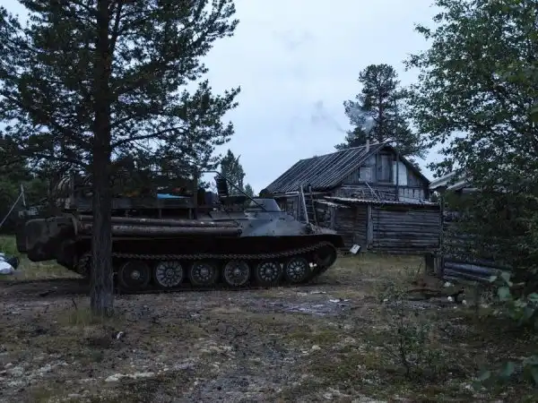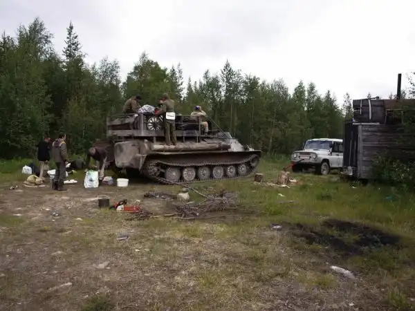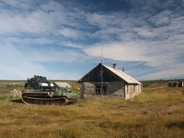 Первый день дороги на вездеходе подошел к концу, и уже глубокой ночью мы подъезжаем к 82-му километру. Здесь находится пустующая ныне изба телефониста и балок. Останавливаемся на ночь. Начальник собственноручно разбирает вещи, ведь надо быстро накормить 11 человек и успеть отдохнуть: завтра по плану переход через Марьйокские болота.